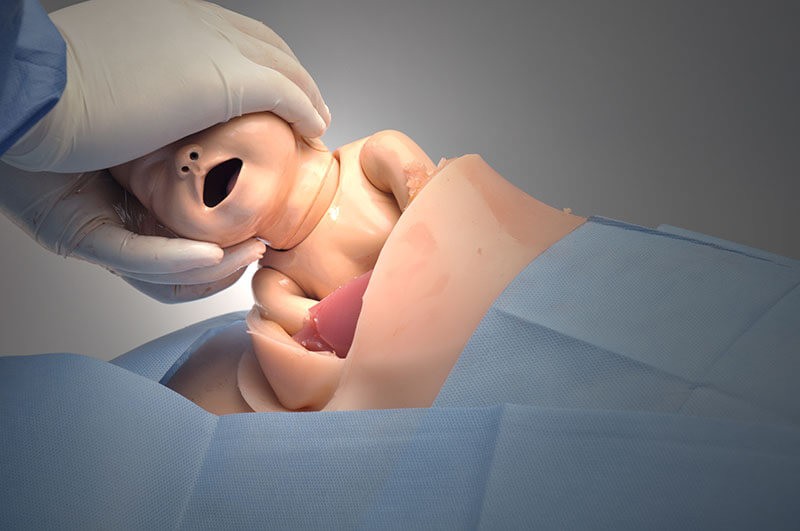 A NOELLE permite que os participantes pratiquem partos em cesariana usando instrumentos cirúrgicos reais para aprimorar habilidades psicomotoras para incisões, extrações fetais e suturas